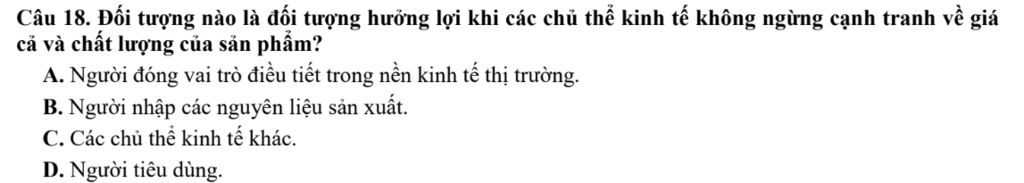Câu 18. Đối tượng nào là đối tượng hưởng lợi khi các chủ thể kinh tế không ngừng cạnh tranh về giá cả và chất lượng của sản phẩm?