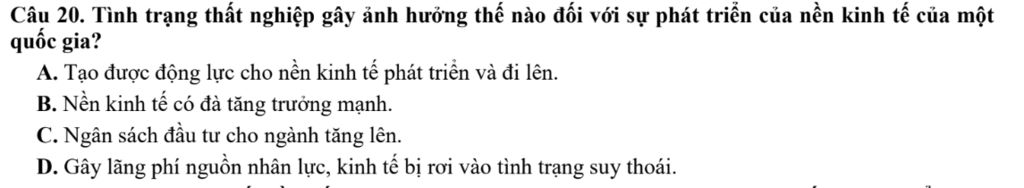 Câu 20. Tình trạng thất nghiệp gây ảnh hưởng thế nào đối với sự phát triển của nền kinh tế của một quốc gia?