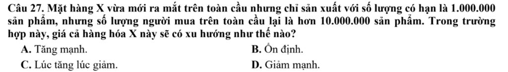 Câu 27. Mặt hàng X vừa mới ra mắt trên toàn cầu nhưng chỉ sản xuất với số lượng có hạn là 1.000.000 sản phẩm, nhưng số lượng người mua trên toàn cầu lại là hơn 10.000.000 sản phẩm. Trong trường hợp này, giá cả hàng hóa X này sẽ có xu hướng như thế nào?