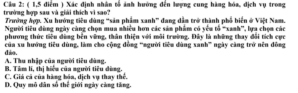 Câu 2: ( 1,5 điểm ) Xác định nhân tố ảnh hưởng đến lượng cung hàng hóa, dịch vụ trong trường hợp sau và giải thích vì sao?