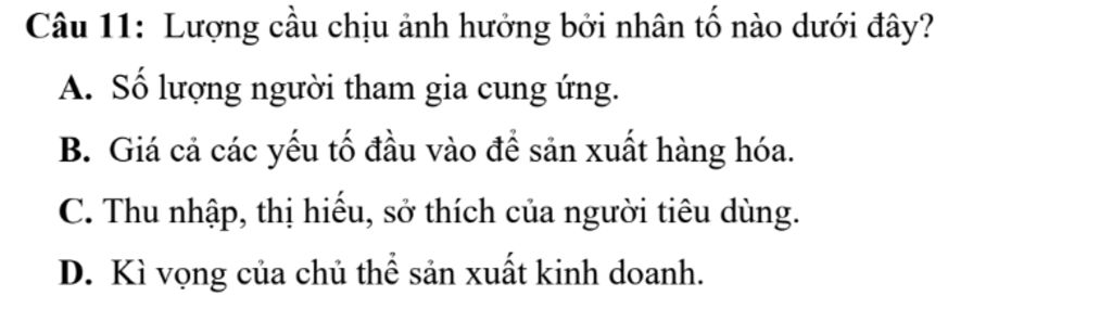 Câu 11: Lượng cầu chịu ảnh hưởng bởi nhân tố nào dưới đây?