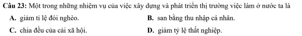 Câu 18: Việc đẩy mạnh xuất khẩu lao động là góp phần trực tiếp vào việc phát triển thị trường nào dưới đây?