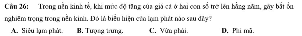 Câu 26: Trong nền kinh tế, khi mức độ tăng của giá cả ở hai con số trở lên hằng năm, gây bất ổn nghiêm trọng trong nền kinh. Đó là biểu hiện của lạm phát nào sau đây?