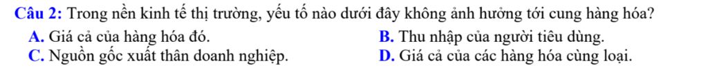 Câu `2`: Trong nền kinh tế thị trường, yếu tố nào dưới đây không ảnh hưởng tới cung hàng hóa?