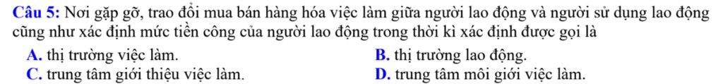 Câu 5: Nơi gặp gỡ, trao đổi mua bán hàng hóa việc làm giữa người lao động và người sử dụng lao động cũng như xác định mức tiền công của người lao động trong thời kì xác định được gọi là