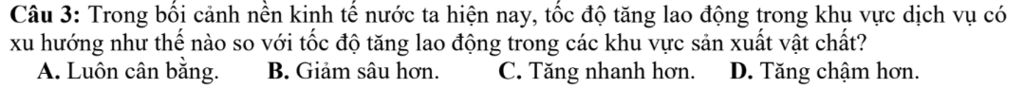 Câu 3: Trong bối cảnh nền kinh tế nước ta hiện nay, tốc độ tăng lao động trong khu vực dịch vụ có xu hướng như thế nào so với tốc độ tăng lao động trong các khu vực sản xuất vật chất?
