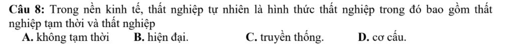 Câu 8: Trong nền kinh tế, thất nghiệp tự nhiên là hình thức thất nghiệp trong đó bao gồm thất nghiệp tạm thời và thất nghiệp