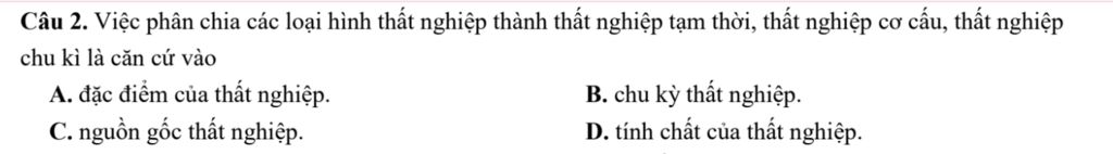 Câu 2. Việc phân chia các loại hình thất nghiệp thành thất nghiệp tạm thời, thất nghiệp cơ cấu, thất nghiệp chu kì là căn cứ vào
