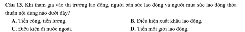 Câu 13. Khi tham gia vào thị trường lao động, người bán sức lao động và người mua sức lao động thỏa thuận nội dung nào dưới đây?