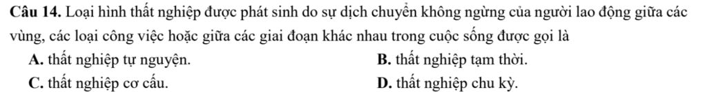 Câu 14. Loại hình thất nghiệp được phát sinh do sự dịch chuyển không ngừng của người lao động giữa các vùng, các loại công việc hoặc giữa các giai đoạn khác nhau trong cuộc sống được gọi là