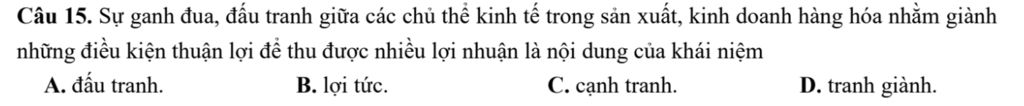 Câu 15. Sự ganh đua, đấu tranh giữa các chủ thể kinh tế trong sản xuất, kinh doanh hàng hóa nhằm giành những điều kiện thuận lợi để thu được nhiều lợi nhuận là nội dung của khái niệm