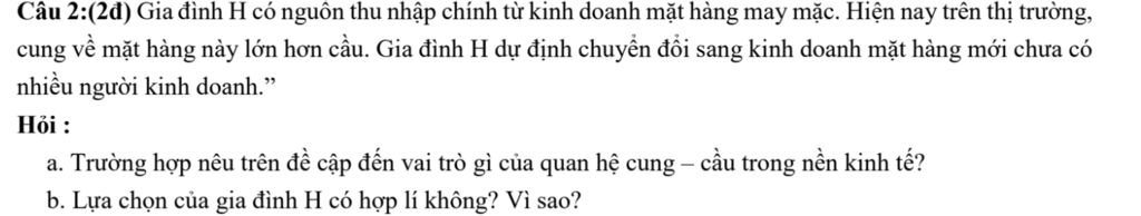 Câu 2:(2đ) Gia đình H có nguồn thu nhập chính từ kinh doanh mặt hàng may mặc. Hiện nay trên thị trường, cung về mặt hàng này lớn hơn cầu. Gia đình H dự định chuyển đổi sang kinh doanh mặt hàng mới chưa có nhiều người kinh doanh.” Hỏi: