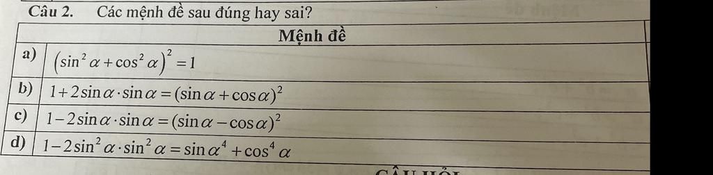a) `sin^2 alpha+ cos^2 alpha=1 => (sin^2 alpha+ cos^2 alpha)^2=1 =>` Đúng