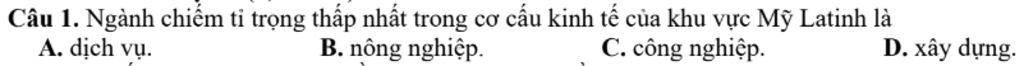 Câu `1.` Ngành chiếm tỉ trọng thấp nhất trong cơ cấu kinh tế của khu vực Mỹ Latinh là