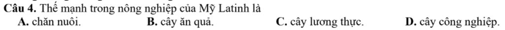 Câu 4. Thế mạnh trong nông nghiệp của Mỹ Latinh là