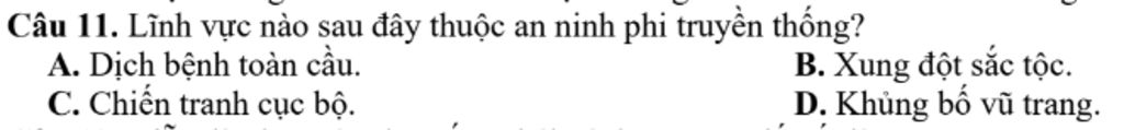 Câu 11. Lĩnh vực nào sau đây thuộc an ninh phi truyền thống?