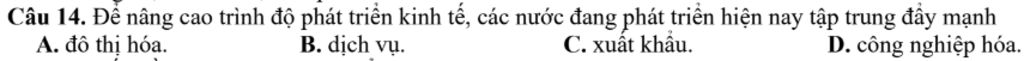 Câu 14. Để nâng cao trình độ phát triển kinh tế, các nước đang phát triển hiện nay tập trung đẩy mạnh