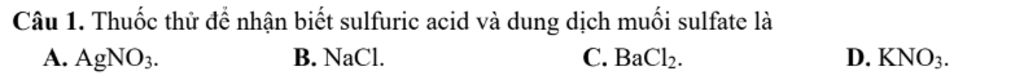 Câu 1. Thuốc thử để nhận biết sulfuric acid và dung dịch muối sulfate là