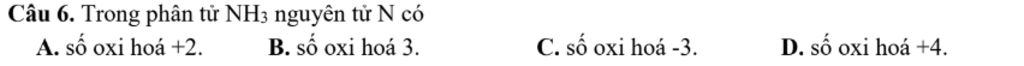 Trong phân tử NH₃ (amoniac), nguyên tử nitơ (N) có số oxi hóa là -3. Điều này được tính dựa trên quy tắc rằng hydro (H) có số oxi hóa +1.
