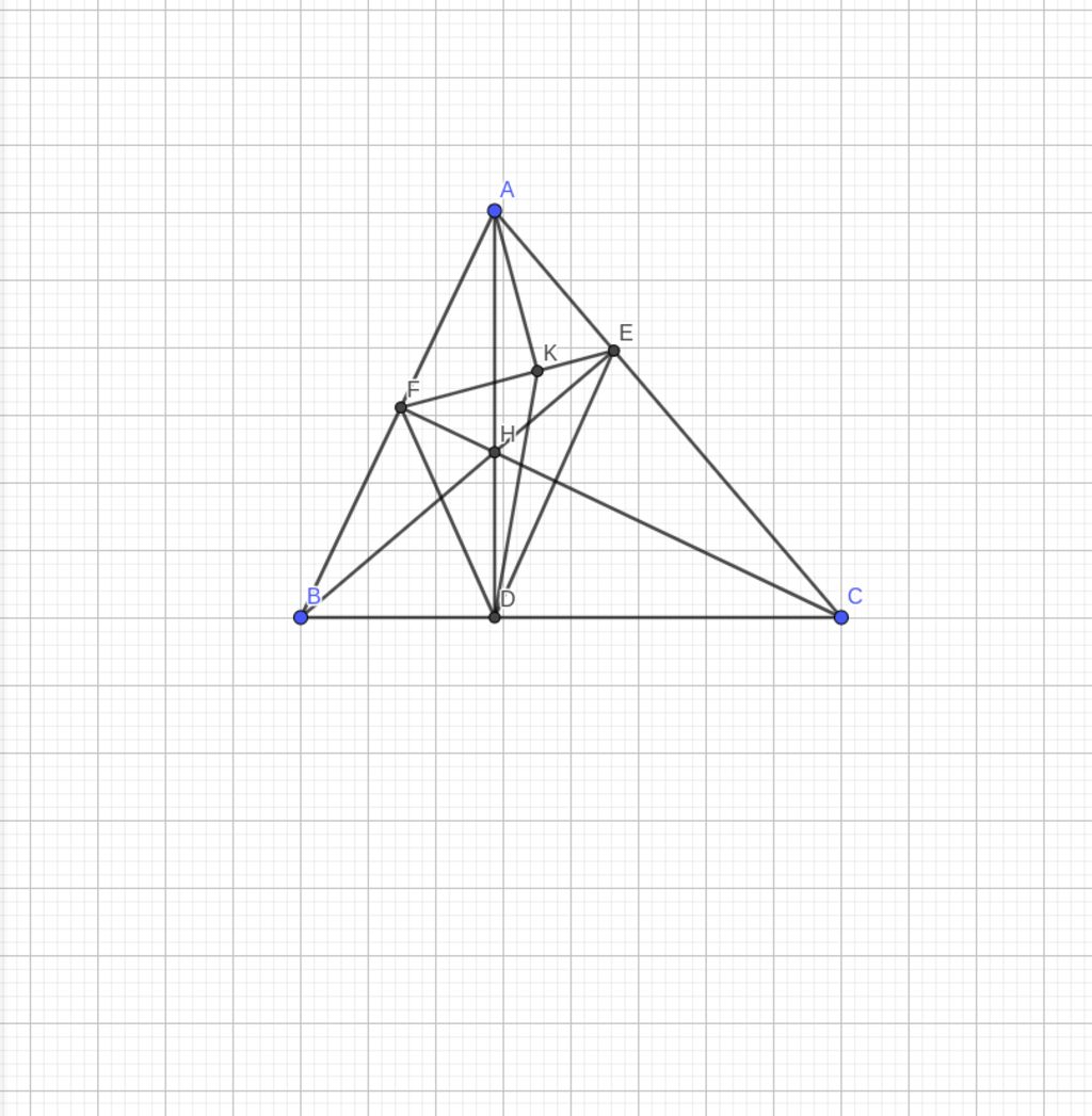 a) Chứng minh rằng hai tam giác AEF và ABC đồng dạng b) Chứng minh rằng H là tâm đường tròn nội tiếp tam giác DEF c) Kẻ AK vuông góc với EF tại K. Chứng minh rằng hai tam giác DEK, DFK có chu vi