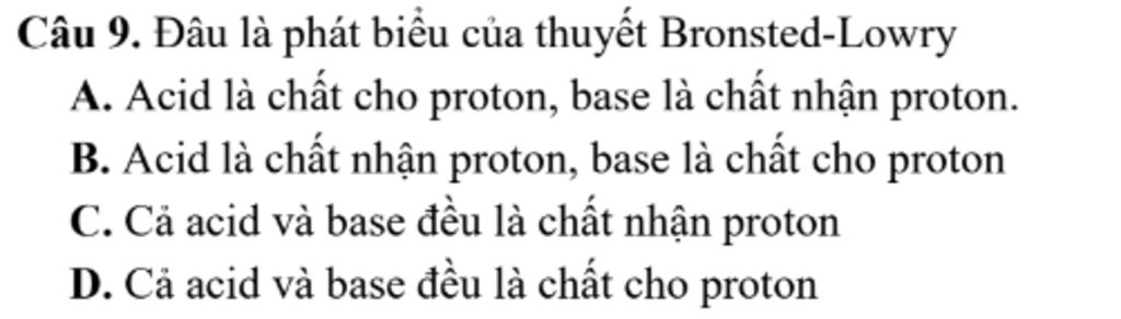 Đáp án:A ( acid là chất nhận P. Base là chất cho P)