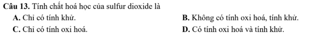 `SO_2` có thể hoạt động như một chất oxi hóa và cũng có thể hoạt động như một chất khử tùy thuộc vào điều kiện phản ứng.