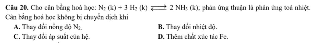 Câu 20. Cho cân bằng hoá học: N2 (k) + 3 H2 (k) $\buildrel{{}}\over\rightleftharpoons$ 2 NH3 (k); phản ứng thuận là phản ứng toả nhiệt.