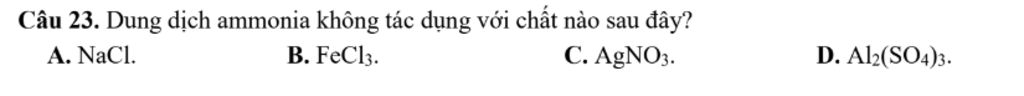 Dung dịch ammonia (`NH3`) không có phản ứng hóa học với NaCl, vì NaCl là muối trung tính và không tương tác với `NH3`