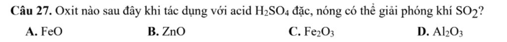 `C. Fe₂O₃`: Tác dụng với `H₂SO₄` đặc, nóng sẽ tạo ra `Fe₂(SO₄)₃` và cũng giải phóng khí `SO₂.`