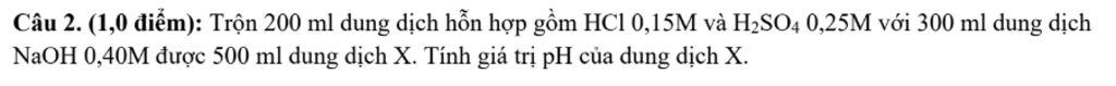 `n_(H^+) = n_(HCl) + 2n_(H_2SO_4) = 0,2 . 0,15 + 2 . 0,2 . 0,5 = 0,13` mol
