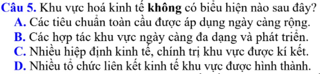 Câu `5. `Khu vực hoá kinh tế không có biểu hiện nào sau đây?