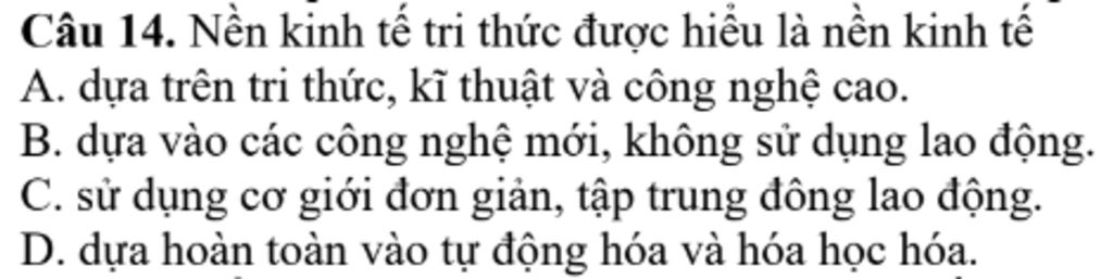 Câu 14. Nền kinh tế tri thức được hiểu là nền kinh tế
