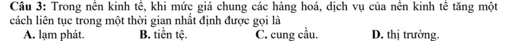 Câu 3: Trong nền kinh tế, khi mức giá chung cách liên tục trong một thời gian nhất định được các hàng hoá, dịch vụ của nền kinh tế tăng một gọi là