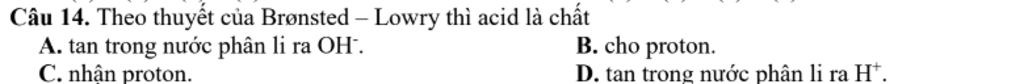 Câu 14. Theo thuyết của Brønsted – Lowry thì acid là chất