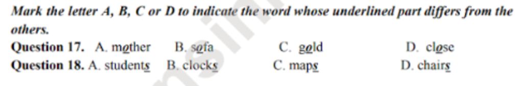 Mark the letter A, B, C or D to indicate the word whose underlined part differs from the others.