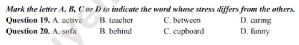 Question 20. A. sofa B. behind C. cupboard D. funny