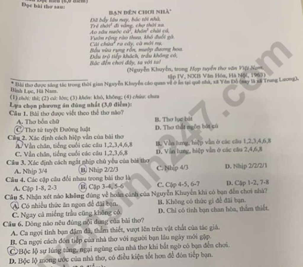 Nhận xét không đúng về hoàn cảnh của Nguyễn Khuyến khi có bạn đến chơi nhà là:có nhiều thức ăn ngon để đãi bạn.