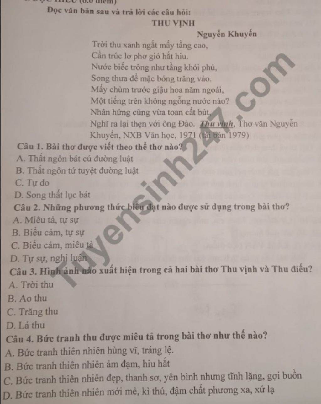 Câu 9 (1,0 điểm): Qua các hình ảnh về mùa thu trong bài thơ, em có cảm nhận như thế nào về tình cảm của tác giả với thiên nhiên?