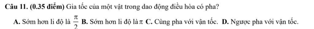 Câu 11. (0.35 điểm) Gia tốc của một vật trong dao động điều hòa có pha?