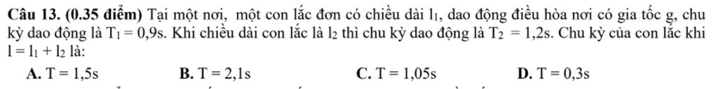 Câu 13. (0.35 điểm) Tại một nơi, một con lắc đơn có chiều dài l1, dao động điều hòa nơi có gia tốc g, chu kỳ dao động là T1 = 0,9s. Khi chiều dài con lắc là l2 thì chu kỳ dao động là T2 = 1,2s. Chu kỳ của con lắc khi l = l1 + l2 là: