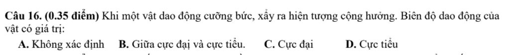 Câu 16. (0.35 điểm) Khi một vật dao động cưỡng bức, xẩy ra hiện tượng cộng hưởng. Biên độ dao động của vật có giá trị: