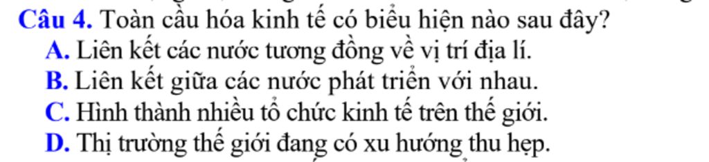 Câu 4. Toàn cầu hóa kinh tế có biểu hiện nào sau đây?
