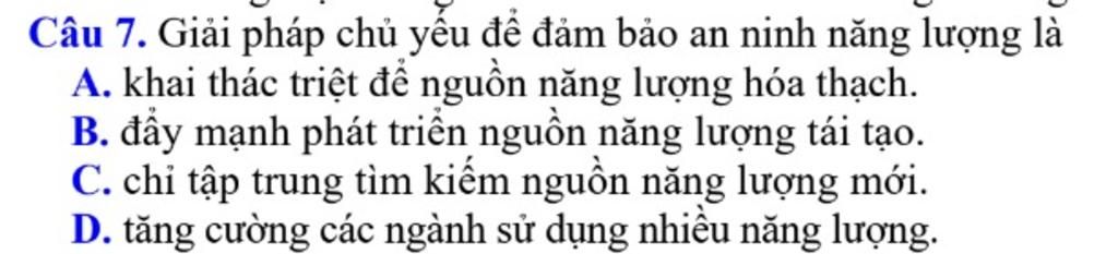 Câu `\bb 7.` Giải pháp chủ yếu để đảm bảo an ninh năng lượng là