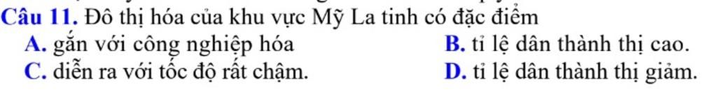 Câu 11. Đô thị hóa của khu vực Mỹ La tinh có đặc điểm