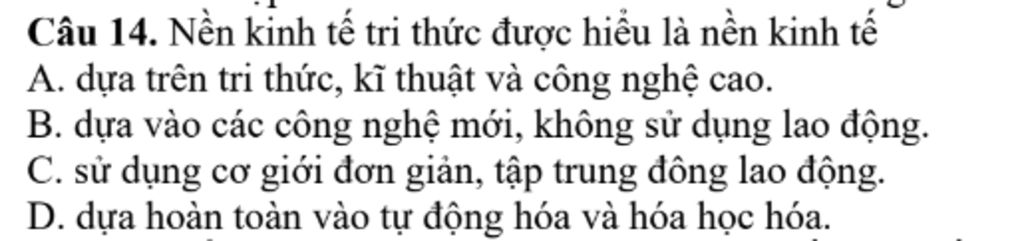 Câu 14. Nền kinh tế tri thức được hiểu là nền kinh tế