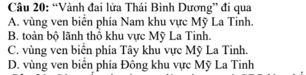 Câu 20: “Vành đai lửa Thái Bình Dương” đi qua