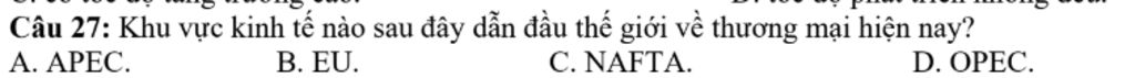 Câu 27: Khu vực kinh tế nào sau đây dẫn đầu thế giới về thương mại hiện nay?