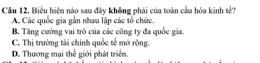 Câu 12. Biểu hiện nào sau đây không phải của toàn cầu hóa kinh tế?