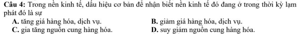 Câu 4: Trong nền kinh tế, dấu hiệu cơ bản để nhận biết nền kinh tế đó đang ở trong thời kỳ lạm phát đó là sự