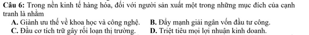 Câu 6: Trong nền kinh tế hàng hóa, đối với tranh là nhằm thể kinh tế trong sản xuất, kinh doanh hàng hóa được nhiều lợi nhuận là nội dung của khái niệm người sản xuất một trong những mục đích của cạnh